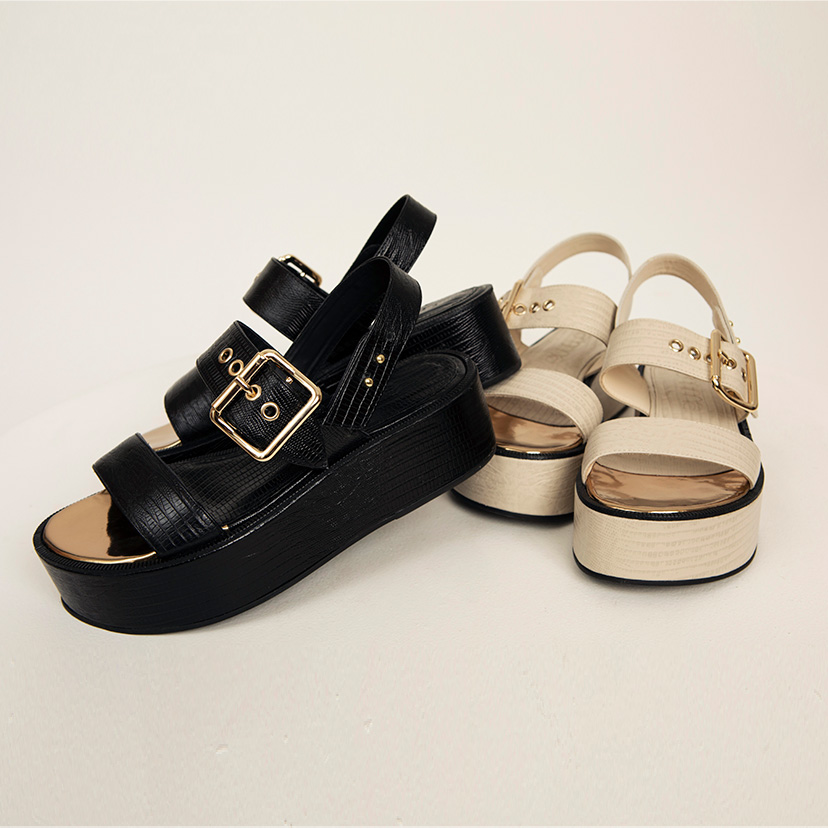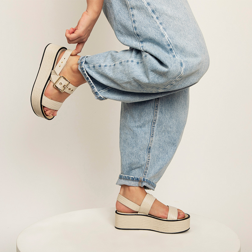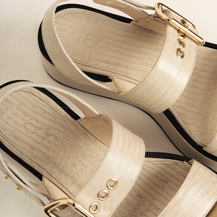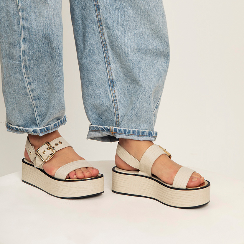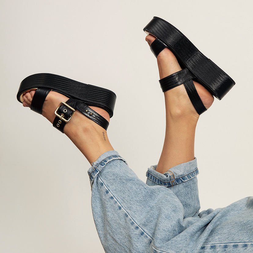 A plataforma envolve o pé em linhas contínuas; a fivela define o desenho com clareza.