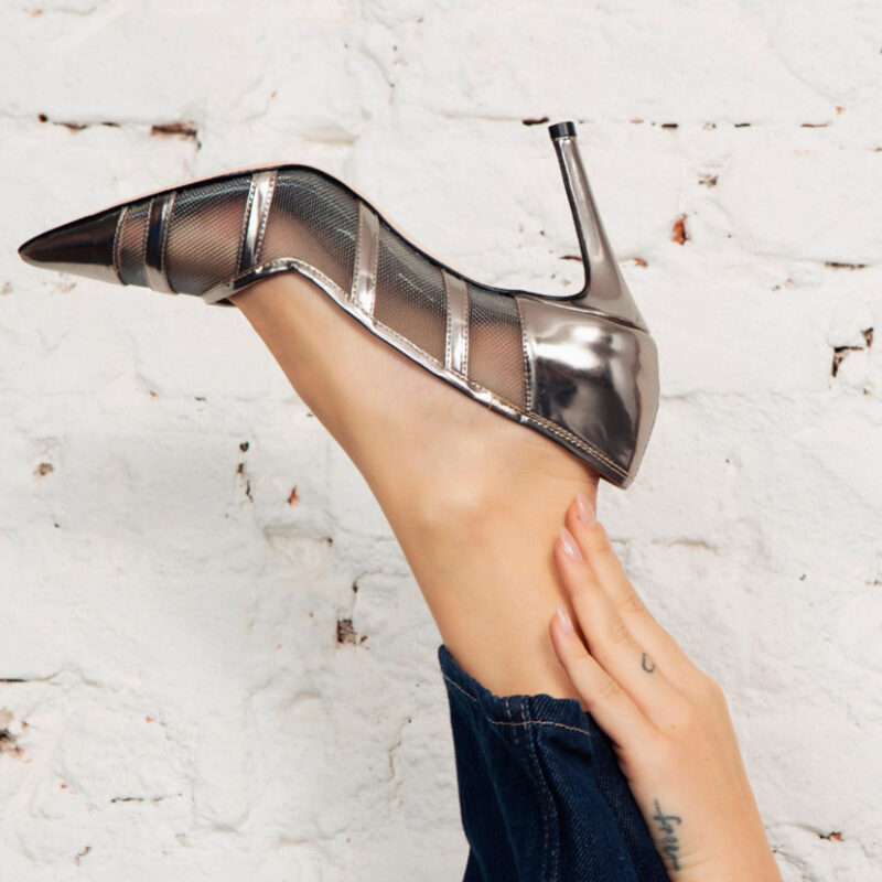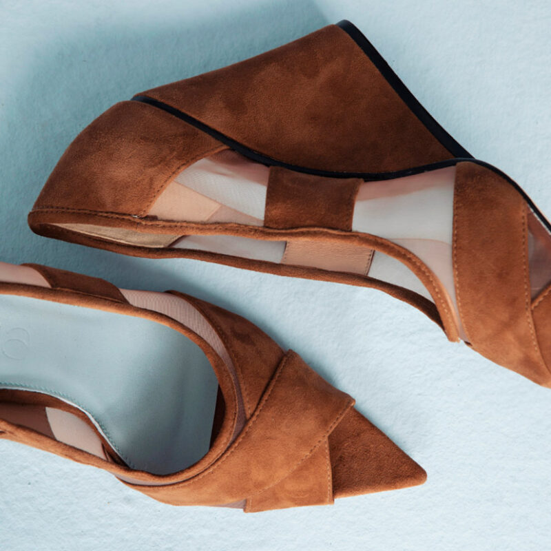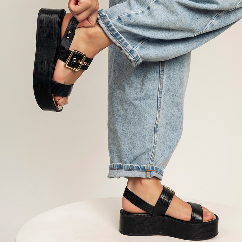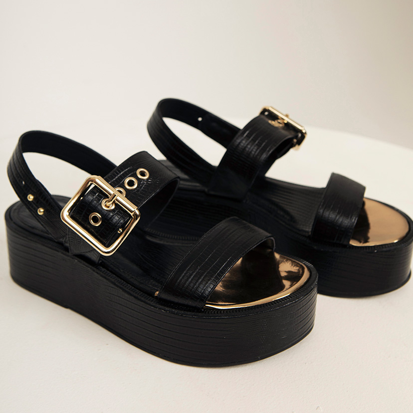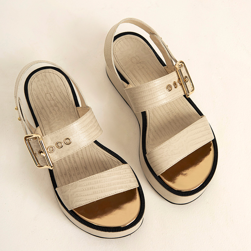 A plataforma envolve o pé em linhas contínuas; a fivela define o desenho com clareza.